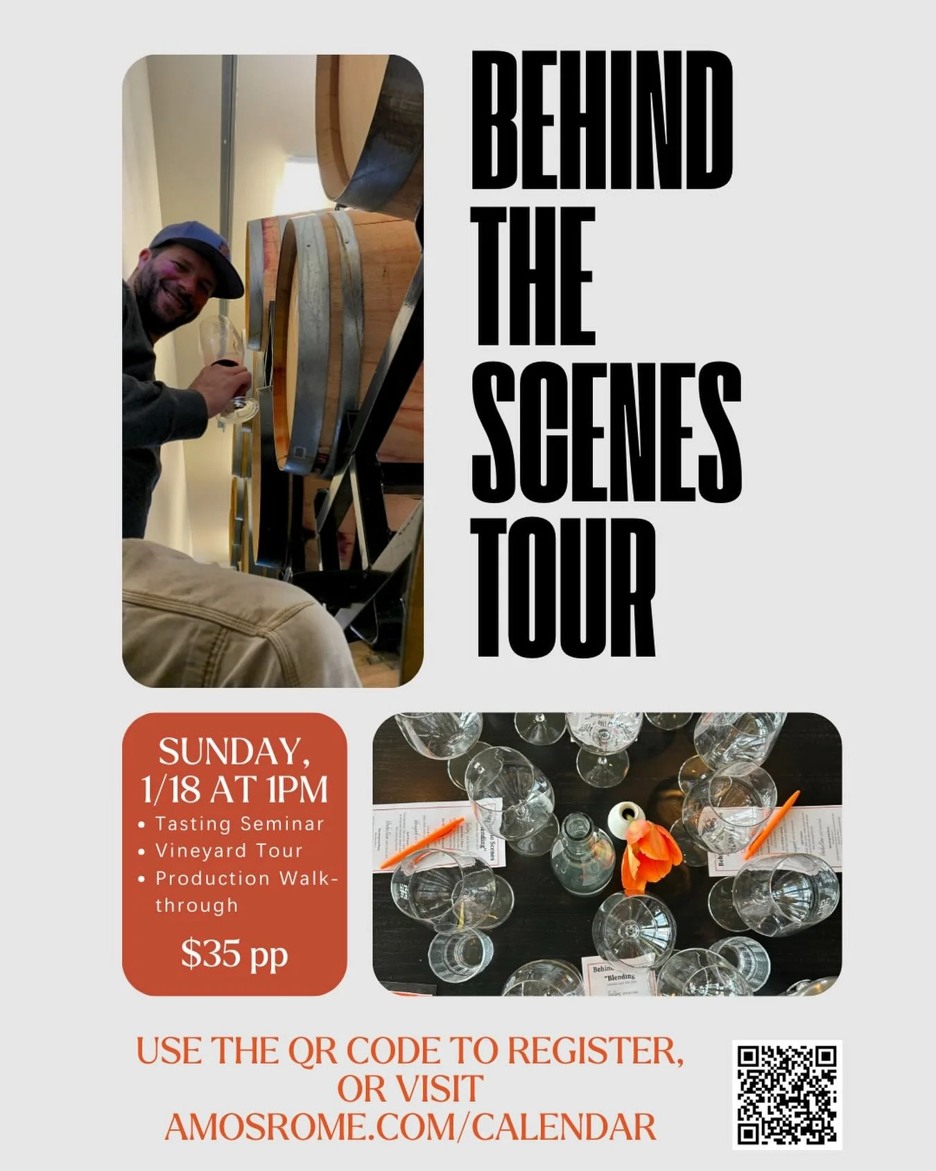 Join us on Sunday, January 18th at 1pm for a 2-hour behind-the-scenes Amos Rome Vineyards Experience!